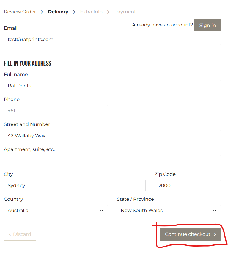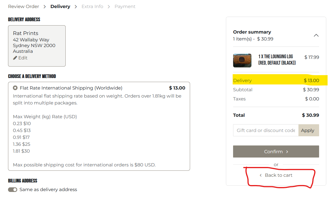 3. You can now see the delivery cost for your cart. Hit "Back to cart" to exit the checkout process.