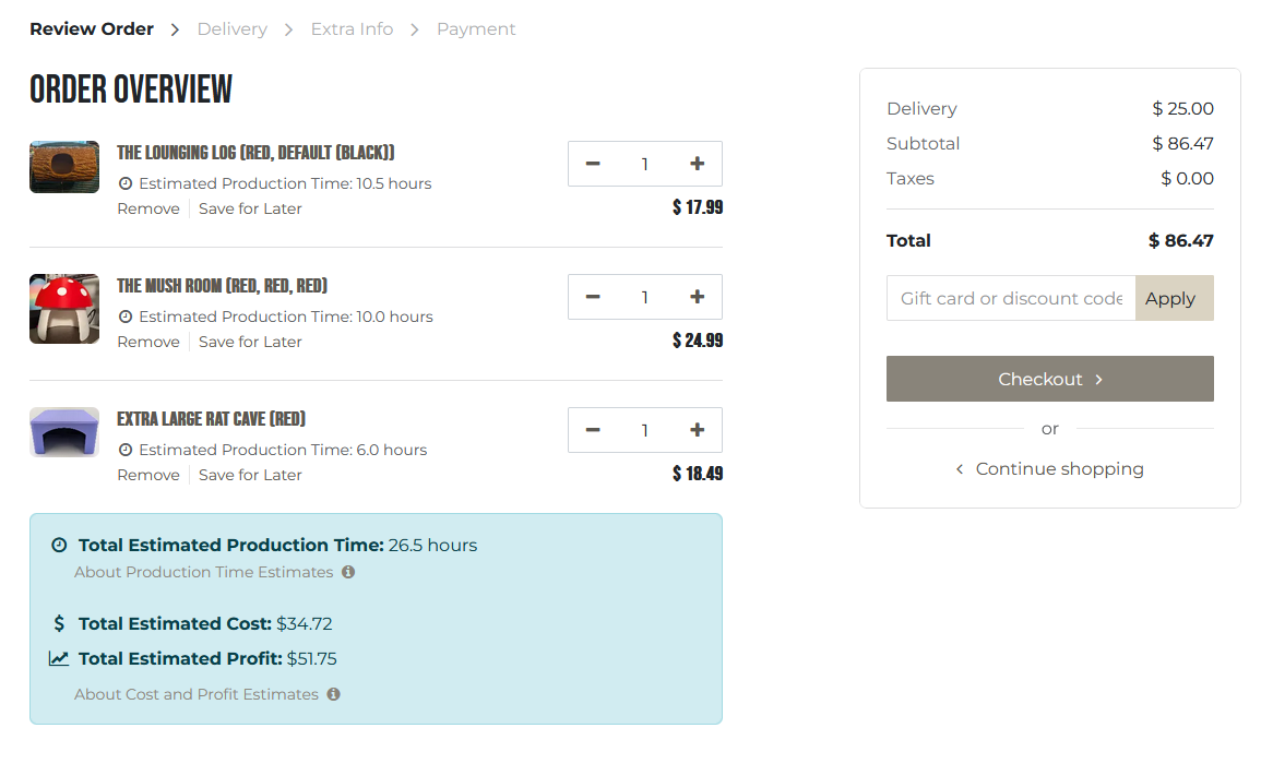 This includes indirect costs like machine wear and maintenance costs, electricity consumption and packaging and shipping supplies. If we're lucky enough to grow and need to employ people in the future, labor costs will also be included here.